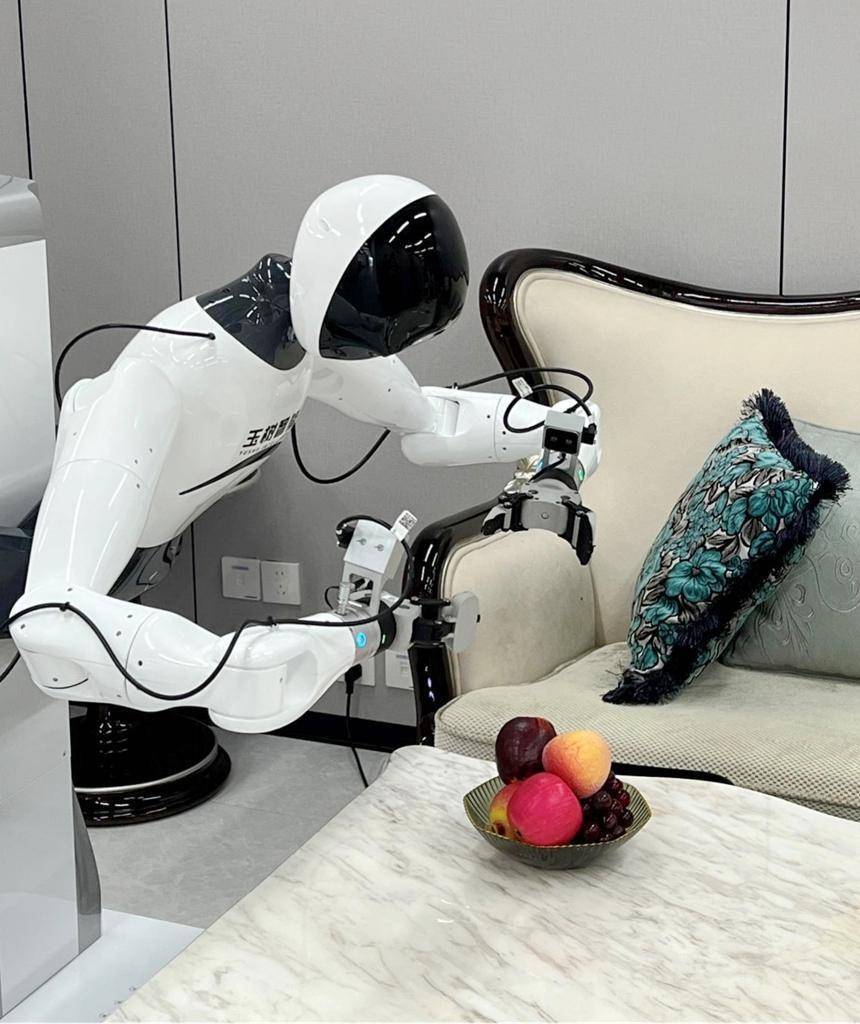 福田区玉树具身机器人智创中心,一台人形机器人正准备拿取水果。艾里士摄