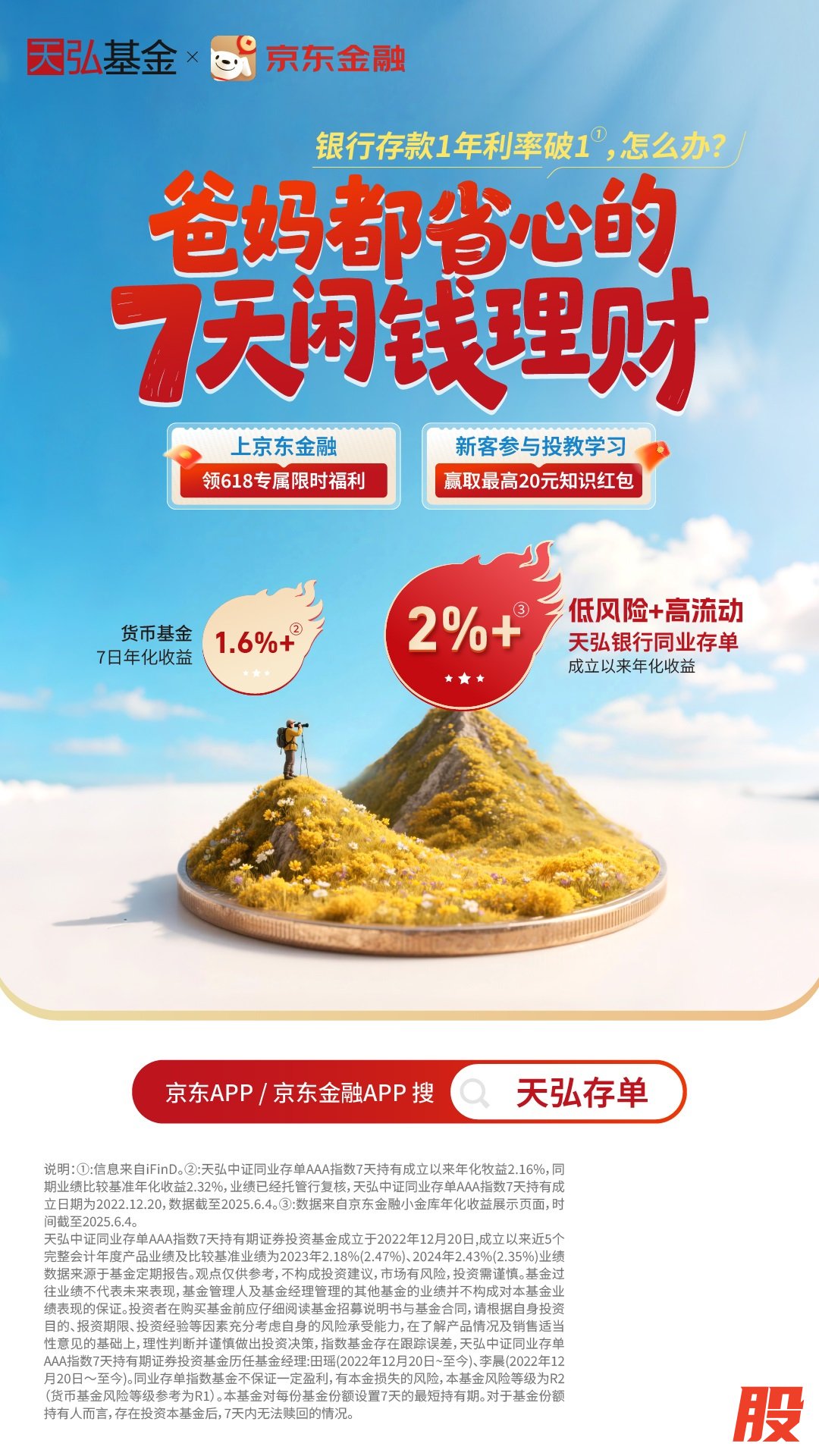天弘中证同业存单AAA指数7天持有期(代码:017423)基金提供了更具竞争力的收益率,而且提供了更高的流动性。特别是在当前利率下行周期中,收益机会显得尤为珍贵。打开京东金融APP,搜索“天弘存单”即可了解详情。